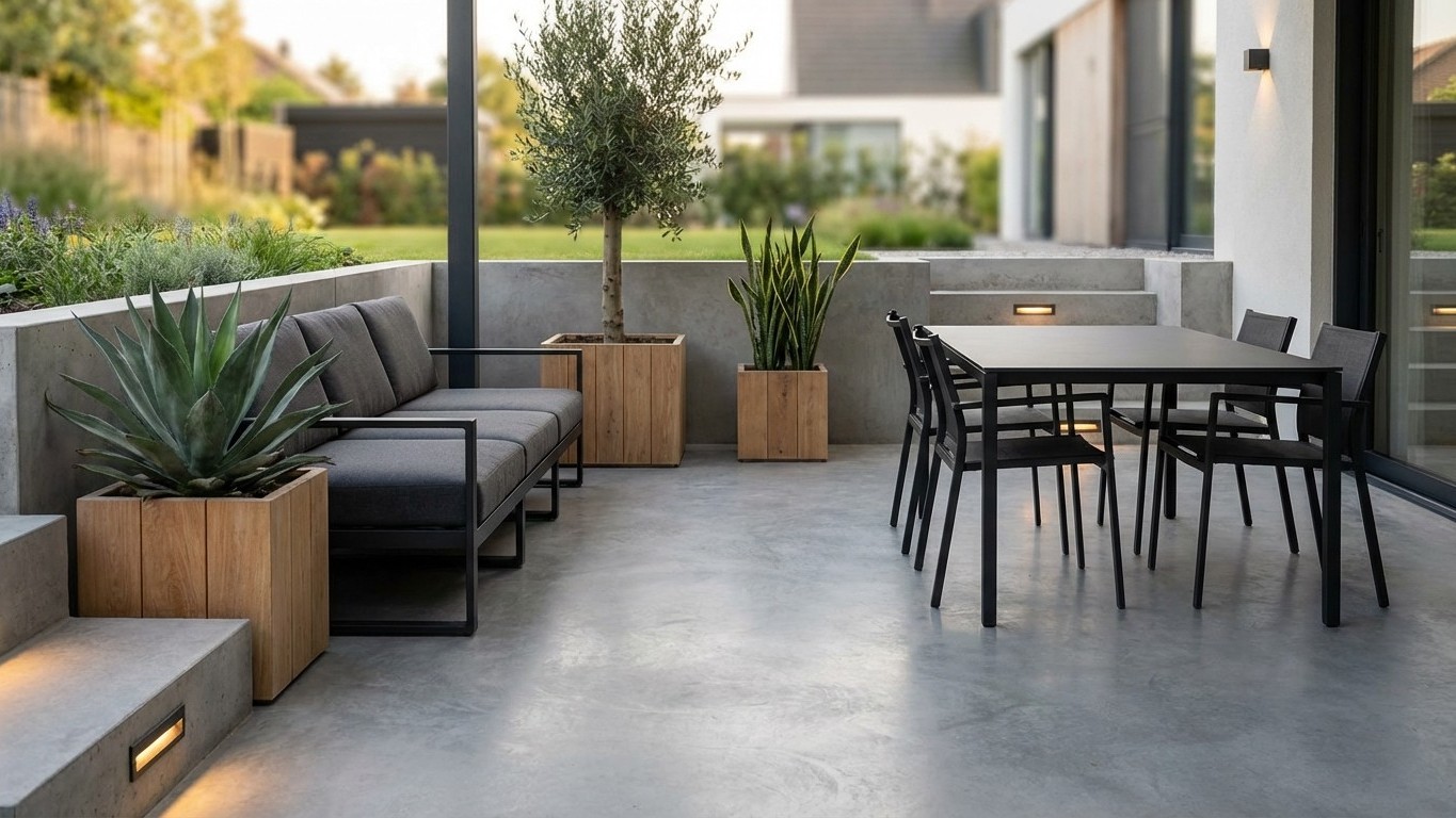 Le sol dicte l’ambiance. Et c’est pour ça que les matériaux minéraux ont pris autant de place : ils “posent” un décor immédiatement moderne. Le béton décoratif, avec des finitions contemporaines, donne une continuité visuelle et un aspect sans joints très recherché sur les terrasses actuelles.